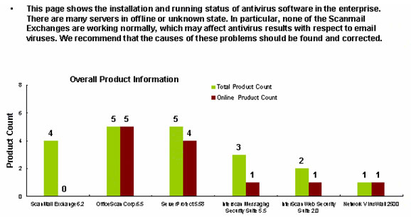 如图所示显示了当前企业内部的防毒软件的安装以及运行状况,由文字和图表两部分组成;文字部分对企业内部的防毒产品安装状态进行综述,对存在的安全问题加以提醒;图表部分将每种不同产品的安装状态分别使用两个不同颜色的柱状图表示,绿色柱状图代表了企业安装的防毒产品的数量;棕色柱状图代表了当前运行良好的防毒产品的数量;如果两者之间的数值不相同,则代表了企业内部有部分产品处于不正常运转的状态下,需要监视原因并进行修复。Online Product Count的数值是提取数据当时的数值,由于该状态随时会发生变化,所以需要在介绍时特别加以说明。