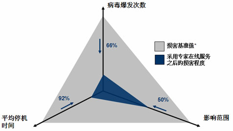 根据趋势科技的估计,采用这样的防毒专家服务方案之后,整体损害将能降低 98.6%,病毒爆发次数可减少66%,损害影响范围可缩减50%,而停机时间可缩减92%。