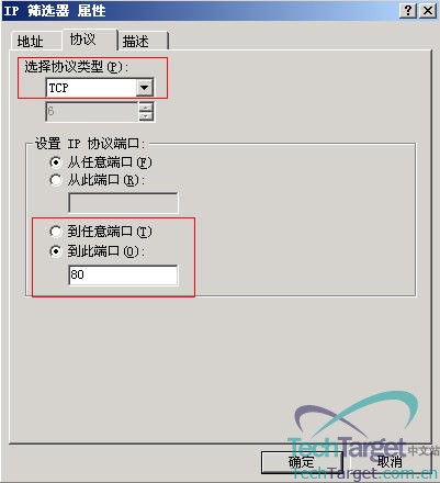 在“选择协议类型”里选择“TCP”,并且在“到此端口”中输入:80,因为HTTP用的就是80端口,然后点“确定”退出: