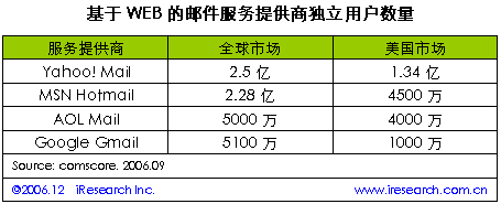 iResearch艾瑞市场咨询根据市场咨询公司comscore的调查结果整理显示,在2006年9月基于WEB的邮件服务提供商中,Yahoo! Mail在全球市场的独立用户数达到2.5亿,在美国市场为1.34亿;MSN Hotmail在全球市场的独立用户数为2.28亿,在美国市场为4500万。
