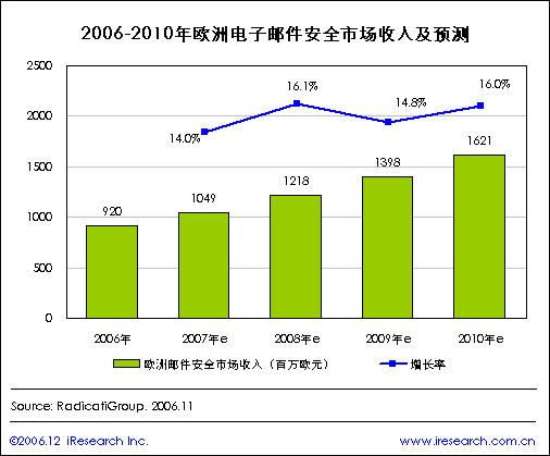 iResearch艾瑞市场咨询根据市场咨询公司RadicatiGroup公布的调查结果整理显示,在2006年欧洲电子邮件安全市场收入达到9.2亿欧洲元,预计2007年超过10亿欧元,电子邮件安全市场收入包括相关软件收入及应用收入。