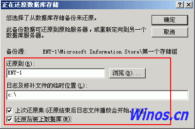 点击还原后输入还原是log存放的位置,勾上下面的两个选项,让还原后直接装载数据库