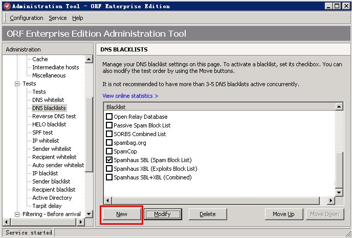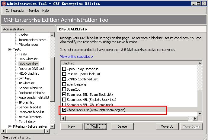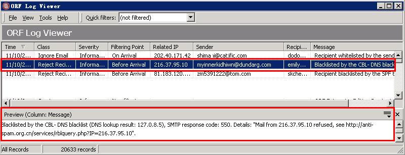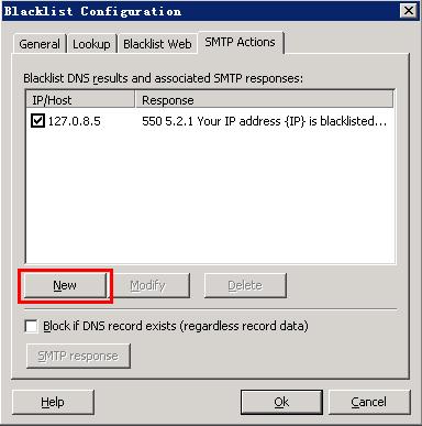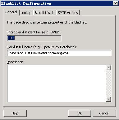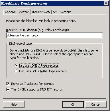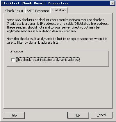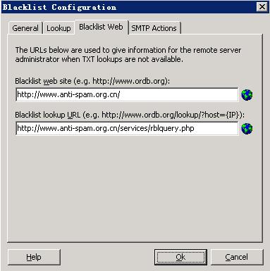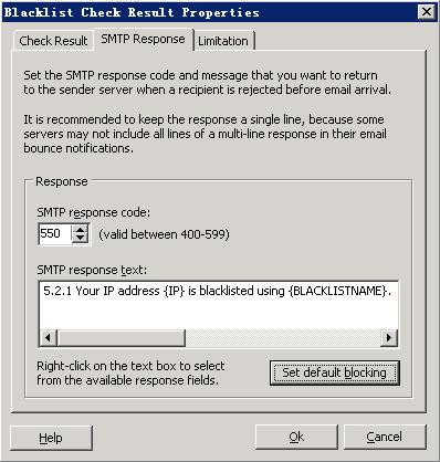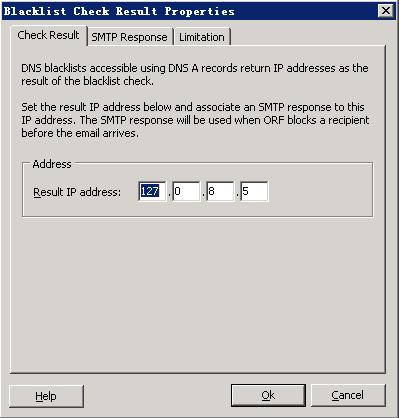 建议使用CBL-黑名单减少误判 (2)输入黑名名 (3)输入DNS黑名单的服务器名 (5)定义相应的拒绝信息,以便让发送方知道被拒绝原因 点"new"加入一个动作 (6)检查结果为127.0.8.5时 则表示发送方IP在黑名单里 CBL/CDL/CBL+/CBL-的配置参数可参见 http://www.anti-spam.org.cn/services/rbl.php#use (7)设定smtp拒绝信息,可自己根据实际需要更改。 缺省配置为"5.2.1 Mailbox unavailable. Your IP address {IP} is blacklisted using {BLACKLISTNAME}." “Mailbox unavaiable"可能会误导发送方,建议把这个词去掉。 (8)不启用"limitation"