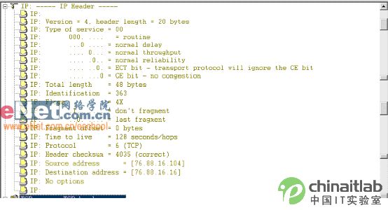 11、Source Address=[76.88.16.104],表示IP数据包源地址为:76.88.16.104.该部分占32个BIT.