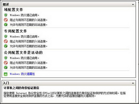 具有高级安全性的Windows防火墙将Windows防火墙功能和Internet 协议安全(IPSec)集成到一个控制台中。使用这些高级选项可以按照环境所需的方式配置密钥交换、数据保护(完整性和加密)以及身份验证设置。