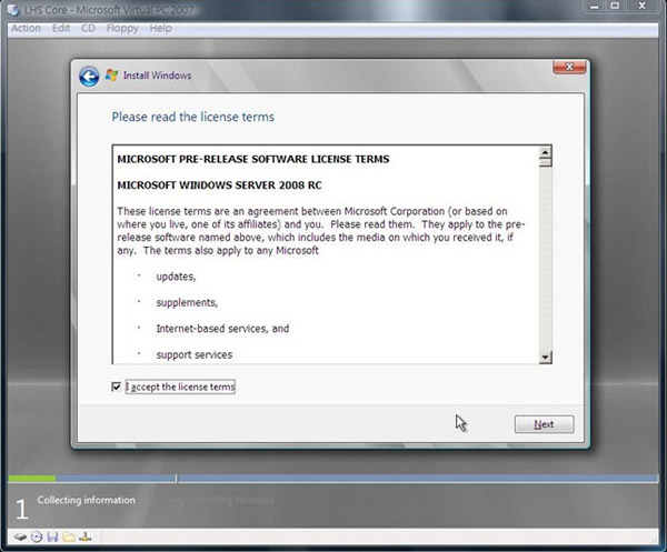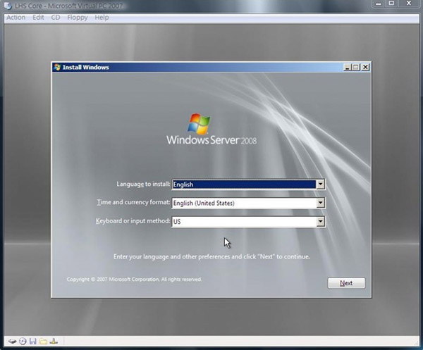 1.首先我們先將 Windows Server 2008 RC 0 光碟片放入光碟機中進行安裝,接著就會看見以下畫面,因為目前還沒有中文版,所以就直接按下 Next: