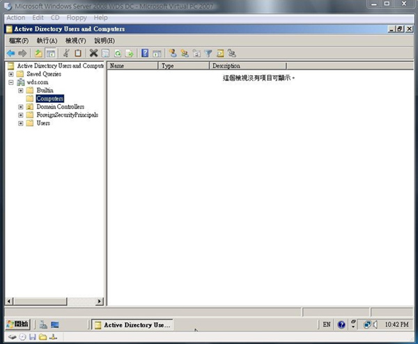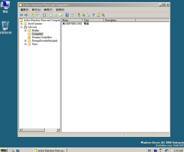 25.在開始進行剛剛新安裝好的機器之前,我們先到預先已經完成 AD 網域的網域控制站的設定畫面看看,首先我們進入到 Active Directory Users and Computers 之中的 Computers 項目,在筆者的環境中目前是完全沒有電腦的,之後因為新加入網域的電腦預設都會先放在這個 OU 單位下,所以我們可以等一下來確認我們剛剛利用 Windows Server Core 安裝方式安裝好的新機器是否有真的成功進入 AD 網域環境中。《在筆者的環境中,網域名稱為 WDS》