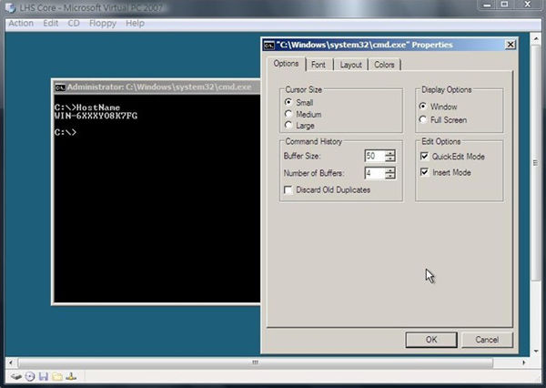 29.為了增加之後編輯指令的便利,我們先將滑鼠指標移動到視窗上方藍色的標題列,之後按滑鼠右鍵、選擇『Properties』,出現設定畫面後,將右下角的 QuickEdit Mode,勾選起來,按下 OK 確認即可。之後只要利用滑鼠指標將指令視窗內想要複製的文字標記起來,然後按下滑鼠右鍵,就會自動的將所選取的文字複製起來,之後再按下滑鼠右鍵,就會將原先的文字貼到指令游標所停留的地方