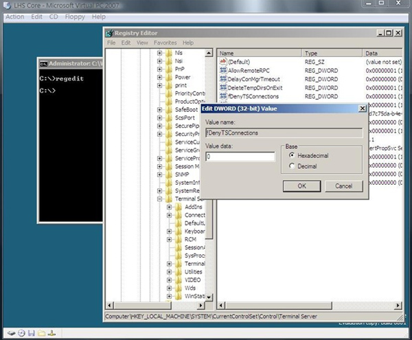 HKEY_LOCAL_MACHINE\SYSTEM\CurrentControlSet\Control\Terminal Server\ fDenyTSConnections = 0