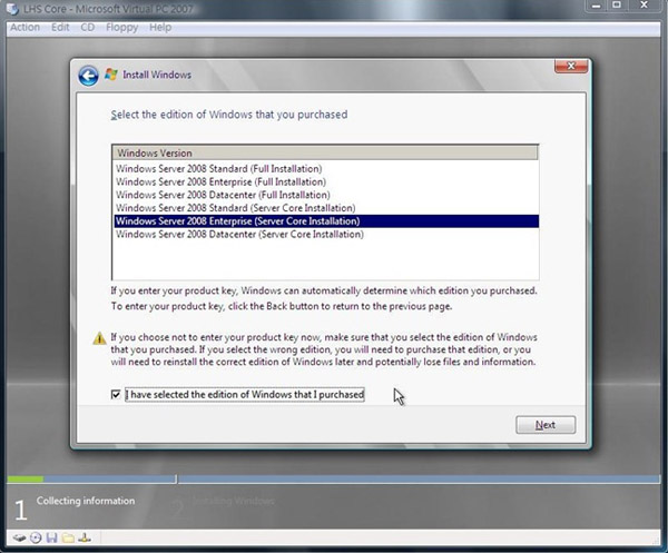 4.倘若先前沒有輸入產品序號,在這個地方就會出現這樣所有 Windows Server 2008 所有的產品呈現的頁面,在此時要選取所要安裝的版本,就是 Windows Server 2008 Enterprise (Server Core Installation),接著在『I have Selected the edition of Windows that I purchased』地方打勾,最後按下 Next