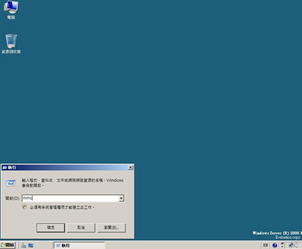 57.我們再回來到網域控制站或者任何網域中任一台電腦,然後啟動程式集當中的執行,打上 MMC,按下 Enter。