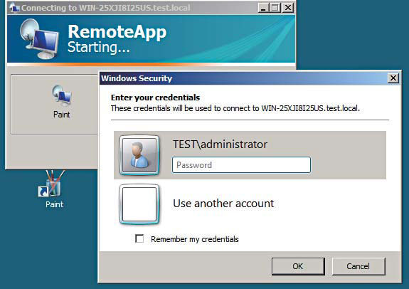 RemoteApp 是新的連線終端服務的方式,因為舊的連線方式為使用者先開啟 RDC 來建立完整的連線,然後看到連線後的視窗畫面再開啟所需使用的應用程式來完成工作。而 RemoteApp 是透過終端機服務連線的方式,讓使用者可以直接開啟所需要使用的已經事先在伺服器上安裝、處理好的 RemoteApp 程式,這些處理好的 RemoteApp 程式會被處理成為所需的 .msi 或 .rdp 檔(這是純文字檔,描述連接所需的資訊),然後管理員將 .msi 或 .rdp 檔佈署給使用者成為桌面的程式捷徑 (利用 msi 檔的安裝) 或桌面的檔案 (rdp 檔直接儲存),使用者使用時直接點按滑鼠兩下,只需透過帳戶資訊的輸入即可使用 (圖 2),如此的使用方式就如同程式是安裝在使用者本機上一樣。(因為不需先啟動 RDC 再開啟程式了)。