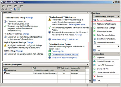 建置佈署方式為管理員先透過 TSRemoteApp Manager 來新增要給使用者的 RemoteApp 程式 (畫面右方的 Action Pane 位置),然後選取適當程式 (或自行瀏覽),程式就會出現在最下方的清單中,接著點選程式然後利用畫面中央的「Other DistributionOptions」來產生所需要的 msi 或 rdp 檔即可完成。(圖 3)