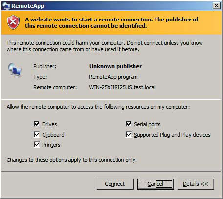 另一個對使用者來說最方便的莫過於新改良過的 TS Web Access (圖 4),首先可以注意到的是連結網只從以往的 http://ServerName(or IP)/tsweb 調整成 http://ServerName(or IP)/ts,透過瀏覽器的使用也可以直接使用管理員處理好的 RemoteApp,如此更能夠方便進行應用軟體佈署,而且啟動 RemoteApp 時也會提醒使用者來進行相關週邊的重導向 (圖 5)。當然 TS Web Access 也有專屬的管理工具可以使用。