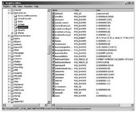 图19 NETCONFIG命令运行前LanmanServer注册表值 运行后的注册表见图20