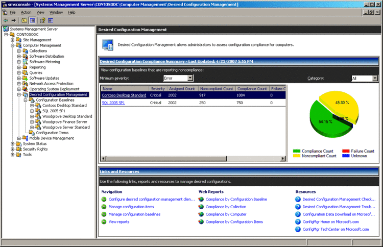 配置管理是 Configuration Manager 2007 中另一个非常显著的改进功能。SMS 2003 所需配置监视在 2006 年秋季发布,并提供了 Configuration Manager 2007 所需配置管理中包含的许多关键功能。有关所需配置监视的背景信息,请参见 TechNet 杂志文章,网址为 microsoft.com/technet/technetmag/issues/ 2006/09/HighStandards。图 7 描述了显示两个特定配置基线符合性的“所需配置管理”主页。