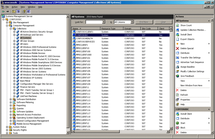 如前面所述,“操作”窗格是新改进的控制台中的主要增强功能之一。它提供了一种查看操作的方法,这些操作与您当前正在使用的控制台部分上下文相关。例如,如果您正在查看“所有系统”集合,“操作”窗格将显示“更新集合成员”和“安装代理”等操作(请参见图 2)。
