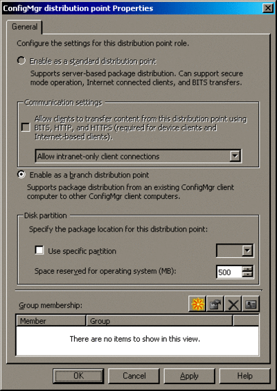 分支机构分发点使用后台智能传输服务 (BITS) 从其他分发点下载信息。这对于限制分支机构和中心数据中心中分发点之间的 WAN 链路带宽很有效,尤其是分支机构不存在 Configuration Manager 辅助站点时。图 3 显示了新的分发点属性对话框,用于将标准分发点转换为分支机构分发点。