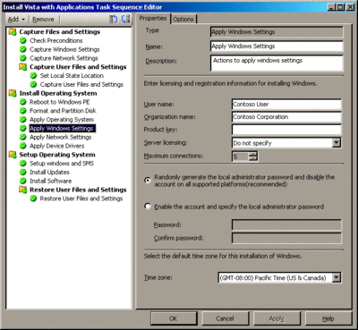 任务排序器可以帮助安排部署操作系统需要执行的所有步骤,包括进行部署前要在较旧的操作系统中执行的步骤(用户状态迁移和应用程序设置转移),部署新操作系统的步骤(设置格式、磁盘分区、产品密钥、用户名、公司、许可证设置、驱动程序安装),以及部署完新系统后要求执行的步骤(其他应用程序安装、更新安装、用户状态迁移)。作为此功能的一个示例,图 4 显示了任务序列编辑器,突出显示了在 Windows Vista 部署中您可以利用的一些功能。