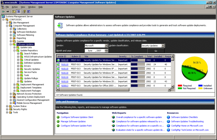 如同 Configuration Manager 2007 中的其他功能,软件更新管理已得到显著改进。通过为所有软件更新和所需配置管理信息创建一个新的基于状态的高优先级通道,Configuration Manager 将向托管代理推出更新和定期程序包的方法分离出来。推出其他软件包不会防碍推出软件更新或从托管的工作站、笔记本电脑或服务器接收修补程序状态。