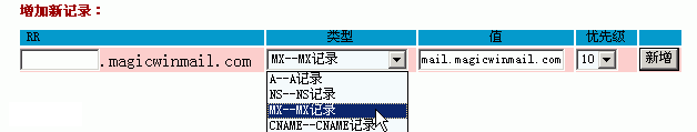 3.在"增加新记录"下增加 MX 记录,类型选择 MX--MX 记录,值可以填写主机名(也可以理解为您的域名的子域),也可以填写 IP 地址或是域名。我们这里填写主机名: mail.magicwinmail.com. ,优先级一般设置为 10。