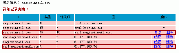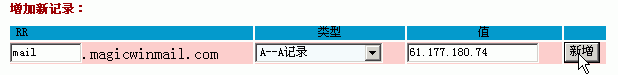 4.如果 MX 记录设置的值为主机名或是域名,则需要增加对应的 A 记录。例如我们 MX 记录的值设置的是 mail.magicwimail.com.,则需要增加一条相应的 A 记录。