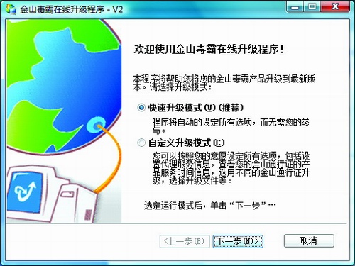 病毒库是否能够及时、顺利的升级可以说直接决定一个杀毒软件查杀病毒的能力。金山毒霸for Windows Vista版在VISTA下能快速连接升级服务器,下载最新的病毒库,也能正常自动更新病毒库,与Vista的兼容性非常好。