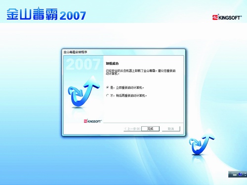 金山毒霸2007和安装一样能够很快速的卸载,而且同安装一样需要重新启动计算机,但是卸载不是很彻底,卸载完成后kingsoft的安装文件夹会依然留在系统中。