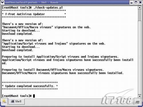 f-prot是依赖当前信息来防止计算机受到新的安全威胁。通过在线升级可以给您的f-prot提供这些新信息,将程序更新和防护更新下载到您的计算机。f-prot安装目录包含一个tools子目录,进入这个目录执行一个perl语言脚步会自动连接到updates.f-prot.com:80端口进行系统的扫描引擎版本和病毒库版本升级,操作如下: