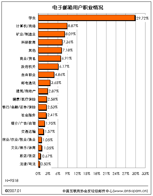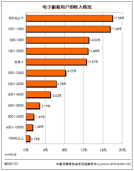 2006年中国第四次反垃圾邮件状况调查结果显示,2006年第四季度,电子邮箱用户职业情况排行中,学生居首位,占电子邮箱个人用户总量的比例为29.72%,计算机/网络类和矿业/制造业类分别居第二、三位,各占比例为8.87%和8.09%。从电子邮箱用户的收入情况显示,收入在500元以下的用户占了电子邮箱个人用户总量的17.98%,收入在1000元到1500元的用户占了17.48%,收入在500元到1000元的用户和1500元到2000元的用户分别占了13.06%和12.88%。从这些数据中可以分析出,电子邮箱个人用户主要集中在中低收入的人群,如何根据用户的职业和收入特征给用户提供更加完善的服务也是各个运营商需要重视的问题,而这些数据也给他们的更新和完善提供了详实的参考依据。