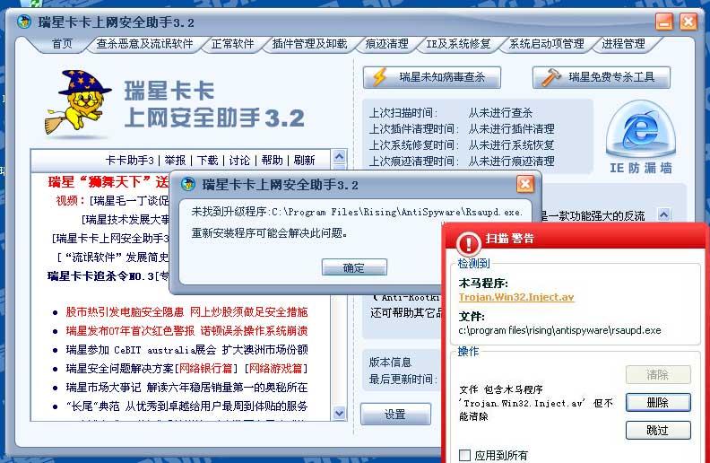 卡巴斯基将瑞星卡卡升级组件当作病毒清除,造成卡卡无法升级