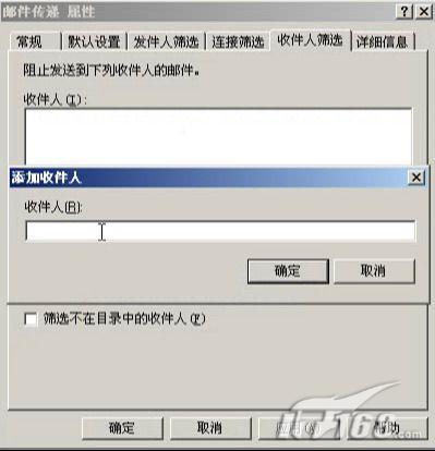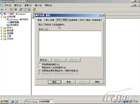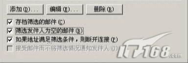 同样,这里还需要选择‘筛选不在目录中的收件人’选项。因为现在有大部分垃圾邮件都是通过发送以本地域名结尾的邮件。例如,假设垃圾邮件厂商以people@it168.com的邮件地址身份发送到IT168内部的邮件域的某个用户的邮箱上。而people以及发送的这个用户也是IT168邮件域中不存在的邮件帐户。当没有选择这个选项的时候,exchange邮件服务器收到这样的邮件会视其为本地邮件,但因为在内部域中没有找到people这个邮件帐户,而把PEOPLE所发送的邮件以广播的形式发送给所有的用户。当选择 ‘选不在目录中的收件人’项以后,发现这样的邮件就会被视为垃圾邮件直接过滤掉。