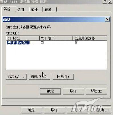 在SMTP虚拟服务器上应用以上配置规则,需要以下几个步骤:在exchange管理器——服务器——协议——SMTP——默认的SMTP虚拟服务器——属性——常规——高级——编辑。(如图10所示)