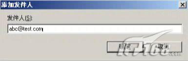2、选择添加。则弹出添加发件人对话框。这里我们可以阻止单个的发件人地址,也可以阻止一个SMTP域,阻止一个SMTP域的填写方式为 @test。com (@后面跟你的域名) 。(如图2所示)
