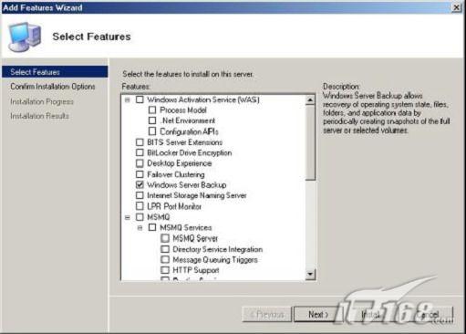 因为在Windows 2008中Backup已经变成一个可选的组件,所以我们在使用前需要先来安装这个工具,通过Initial Configuration Tasks 或者 Server Manager我们都可以安装Backup。