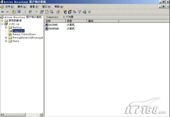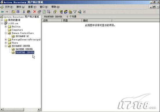1、 为这两台exchange服务器以及域控制服务器建立特定的OU。分别建立BACKEND SERVER和FRONTEND SERVER两个OU。如图2所示