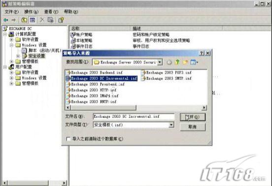 单击计算机配置――》安全配置――》导入策略。如图4所示,导入exchange2003预定义的安全模板。要根据不同角色来选择不同的模板,图4所示的是域控制器,选择域控制器的安全模版,下面有很多其他的安全模板。有前端服务器、后端服务器、POP3、SMTP、IMAP4、NNTP等其他的安全模板。