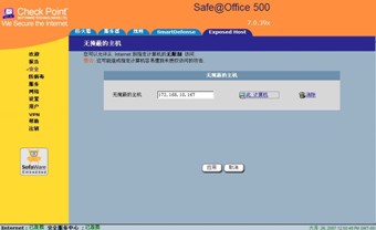 Safe@Office提供的无屏蔽主机设置功能,可以允许从Internet到指定计算机的无限制访问,提供了灵活的访问能力。本测试过程当中,即提供了到此管理主机的无限制访问,此种服务提供方式有可能给服务提供者带来安全隐患,需多加防范;