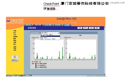 可对LAN、主Internet、DMZ等接口的流量及其状态进行实时查看,以对通过设备这些接口进出的流量进行统计,并形成柱状图以方便观测。同时对流量进行分类,用不同的颜色进行显示,直观的反映出防火墙接受和阻止的通信流量以及VPN加密数据量。