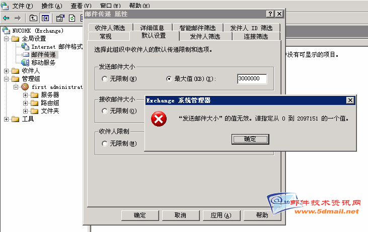 在Exchange Server 针对大小限制设定的操作有好几种.我们都知道的比如:用户邮箱大小,附件大小,传递限制等,有关这些设定的方法,大家可以查找相关的微软的资料,或是之前邮件资讯网论坛(