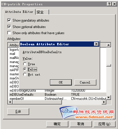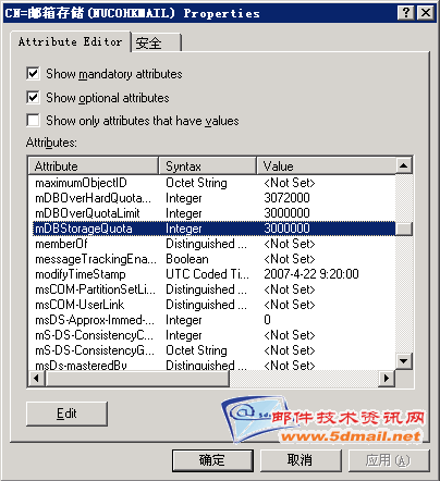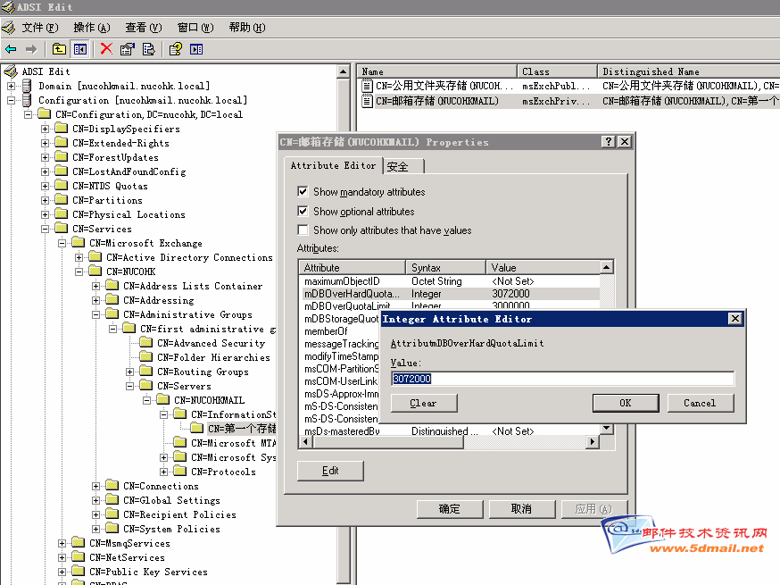 http://www.5dmail.net/bbs)的帖子中了解.其中在Exchange Server中的存储限制,我们可以理解为邮箱大小,也就是我们给用户邮箱有多大的空间,用以存放邮件对像.我们对存储限制的设定,可以通过对存储组中邮件存储或是公用文件夹存储的"限制"选项卡来完成对整个邮件存储或是公用文件夹存储的全局设定,也可以针对特别的用户在此用户属性中的"Exchange 常规"选项卡的"存储限制"中进行设定.但默认情况下,都会遇到不能超过2G也就是2097151KB的限制.曾经有一些朋友问到:不能设成5G或是更高吗? 解决这个问题,需要使用ADSI Edit工具来完成.让我们一起来了解有关大小超默认大小,设定一个超过2G的邮箱.