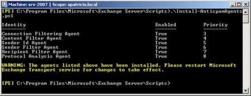 那么,如果没有安装边缘传输服务器,用户就不能使用这些代理来筛选垃圾邮件吗?其实不然,我们可以在集线器传输服务器上安这些筛选代理。方法是,在Exchange 的安装目录下,找到一个专门存放脚本的路径C:\Program Files\Microsoft\Exchange Server\Scripts,运行其中一个脚本,名为Install-AntispamAgents.ps1