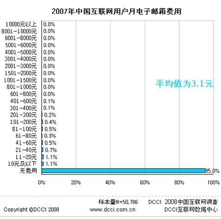 刚刚揭晓的《Netguide2008中国互联网调查报告》相关市场分析显示:2007年中国互联网用户月电子邮箱消费平均为3.1元。2007年中国互联网用户月电子邮箱消费平均为3.1元,有95%的用户无该项支出,使用免费邮箱。
