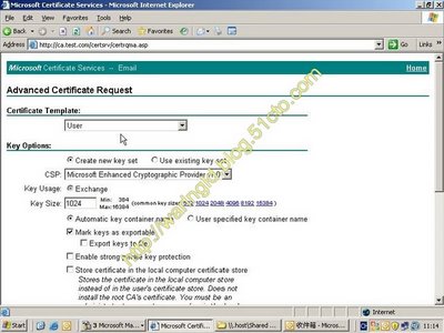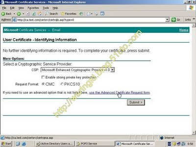 选择"use the Advanced certificate Request form",因为我们要申请的是用于邮件签名的证书,所以必须要申请支持邮件加密功能的证书才行,一般情况下选择"User"证就可以了.