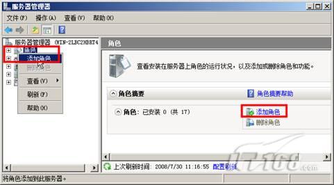 (1)进入"服务器管理器",用鼠标右键单击"角色",从弹出的快捷菜单中选择"添加角色",或者单击右侧的"添加角色"链接(如图5所示),都将进入"选择服务器角色"页,如图6所示,选中"Hyper-V",然后"下一步"按钮。
