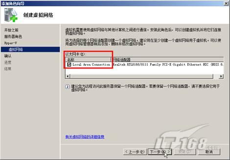 (3)在"创建虚拟网络"页中,选择主机上的"以太网卡",这将为Hyper-V虚拟机添加第一块虚拟网卡。如图8所示。