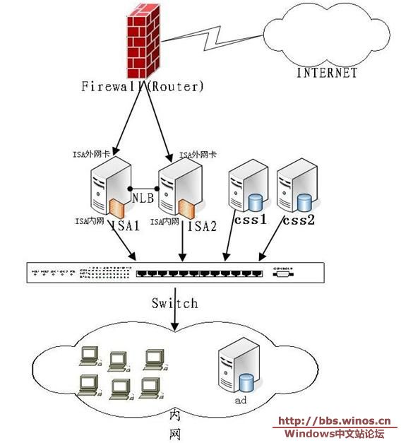 两台ISA企业版服务器做阵列并配置成NLB, 2台ISA服务器通过硬件防火墙连接外部网络 ,2台ISA服务器从2台配置存储服务器读取配置信息(配置服务器是主从关系)。