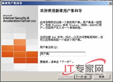 在向导中出现【欢迎使用新建用户集向导】对话框,在【用户集名称】文本框中输入新建的用户的名称为【用户集】,如图2所示。