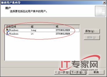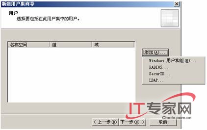 单击【下一步】按钮,出现【用户】对话框,在该对话框中指定用户和组,单击【添加】按钮,选择【Windows用户和组】,如图3所示。