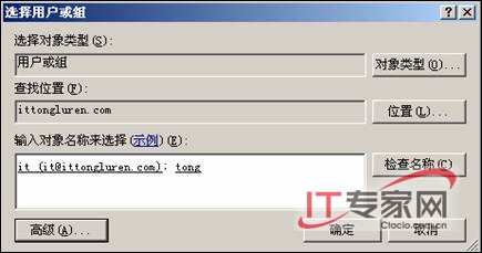 在【输入对象名称来选择】文本框中输入用户和组名称,图5所示,其中it(it@ittongluren.com)是域用户,tong是域组。